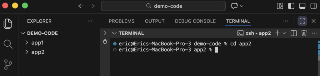 For example, I have 2 Vue projects in my demo-code directory. Each project has its own directory, app1 and app2. I open demo-code with VSC and then change my working directory to app2.