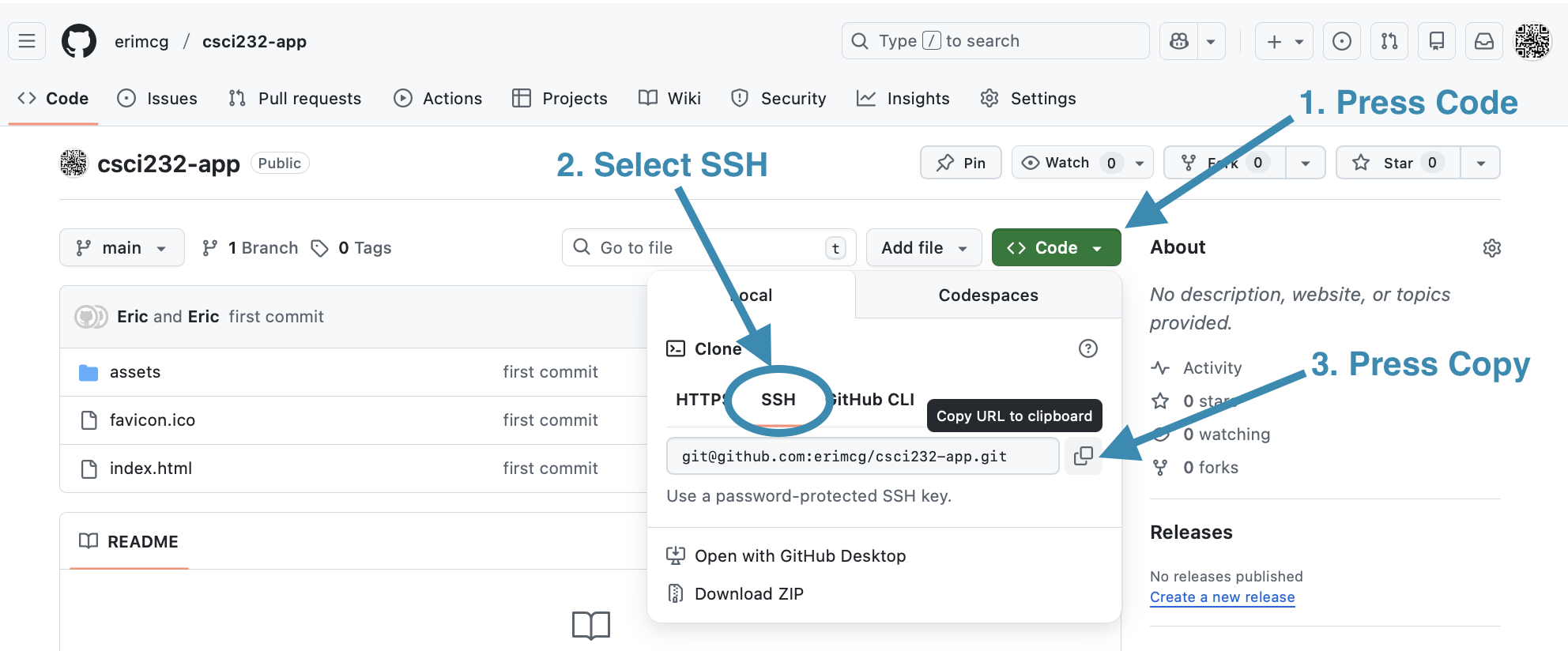 Now find the SSH path for your existing GitHub repository that you previously deployed to Digital Ocean. Navigate a browser to your repo’s page on GitHub. In the <>Code tab, press the green button labelled Code, select the SSH tab and press the copy button.