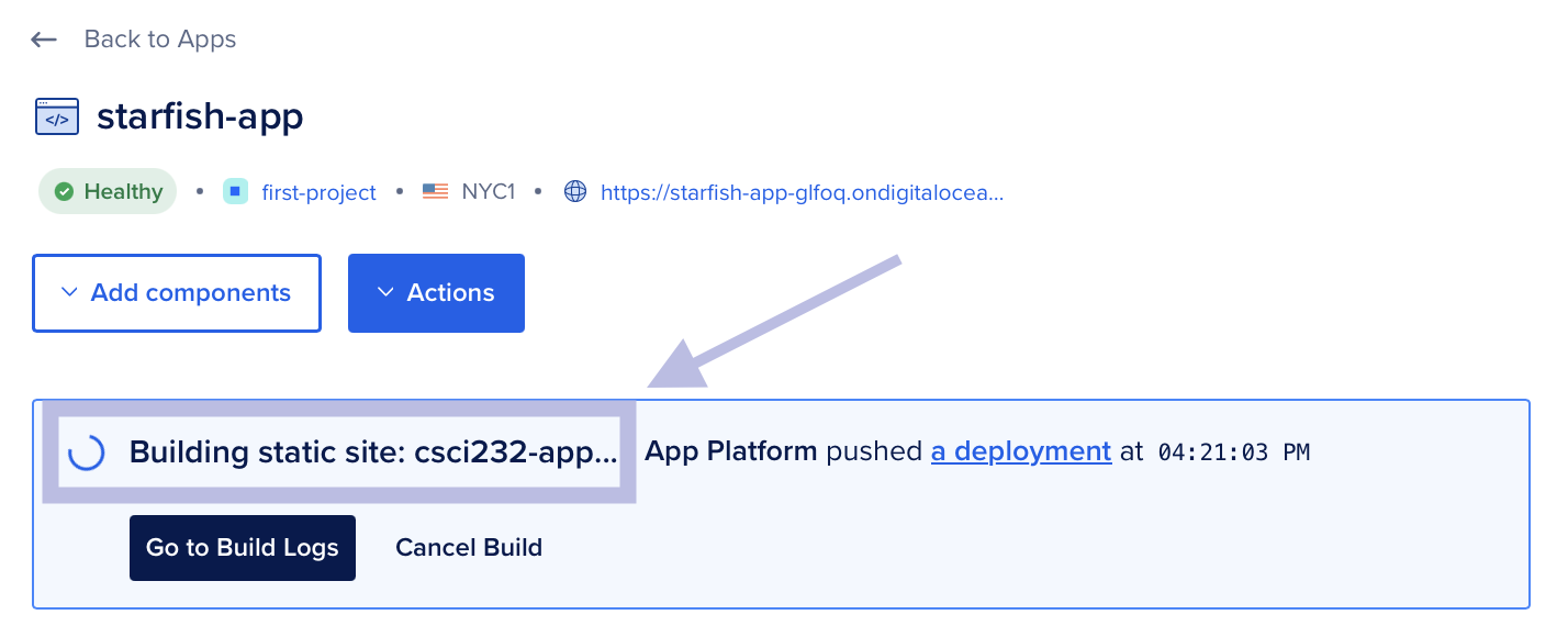 After Digital Ocean has rebuilt your app you should test your deployment by following the link provided by Digital Ocean.