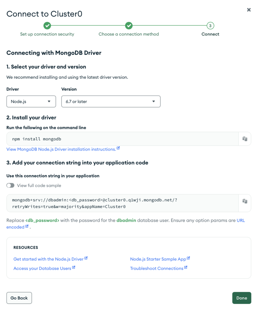 In section 1, select Driver Node.js and Version 6.7 or later.