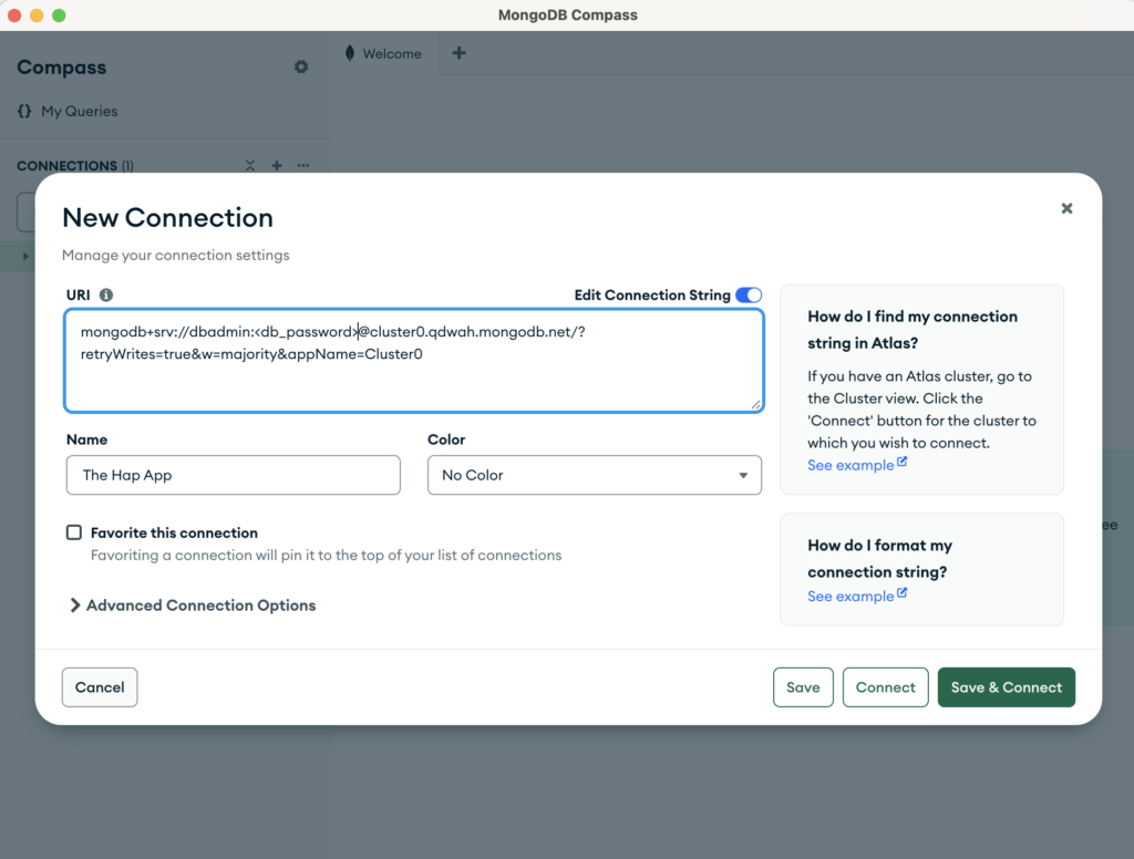 Enter the connection string in the URI input found in the New Connection box, then replace <db_password> in the connection string with your database password.