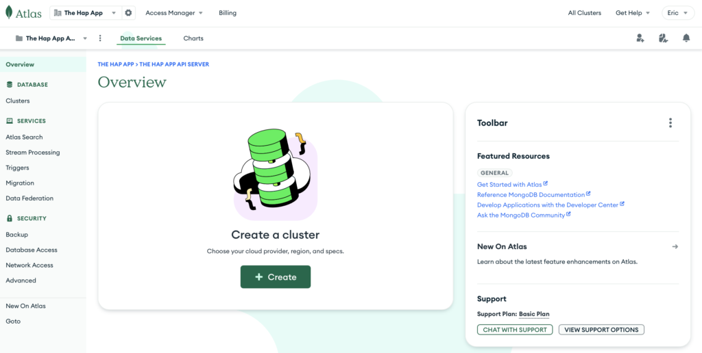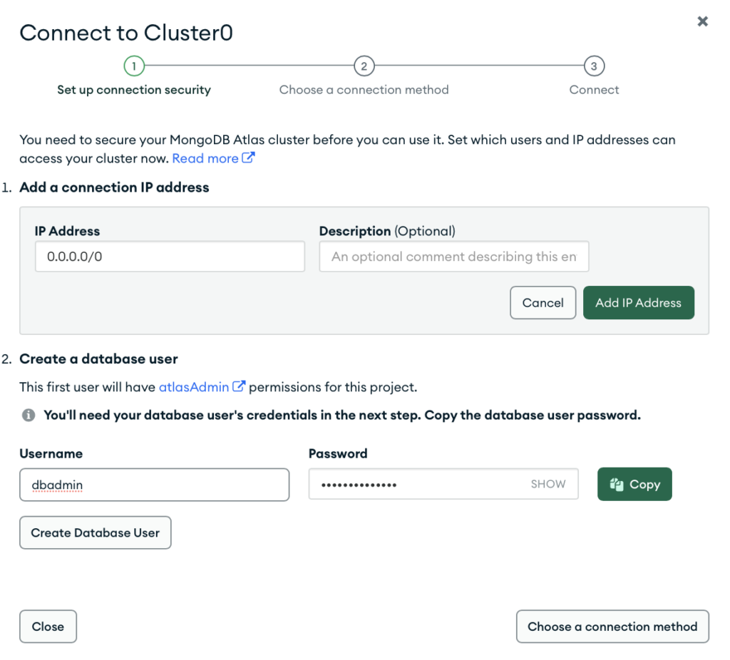 Allow Access from Anywherethen click the button labelled Add IP Address. - In the section labelled Create a database user, add a username, password (use only alpha-numeric characters for password) and then press the button labelled Create Database User. Save the username and password – you’ll need these later.