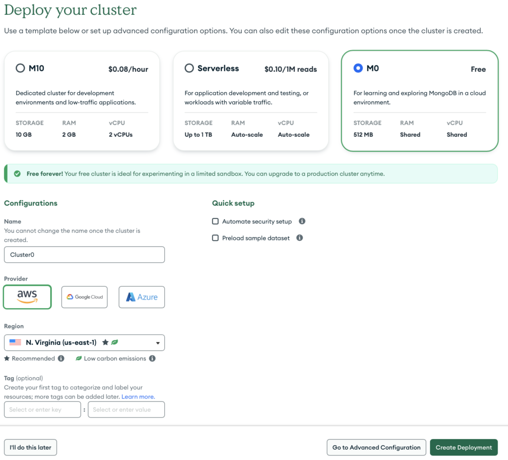 This tutorial is a variation of the instructions in the Deploy a Free Cluster tutorial.